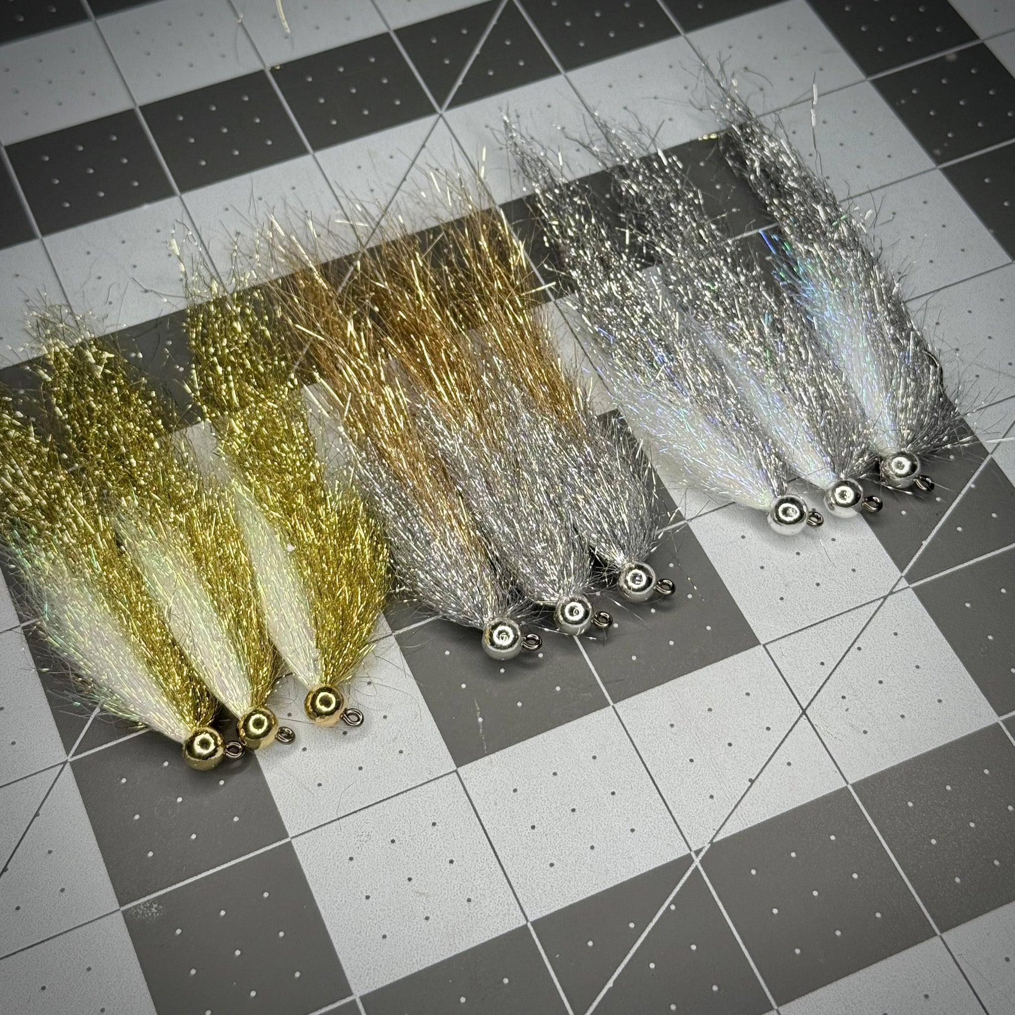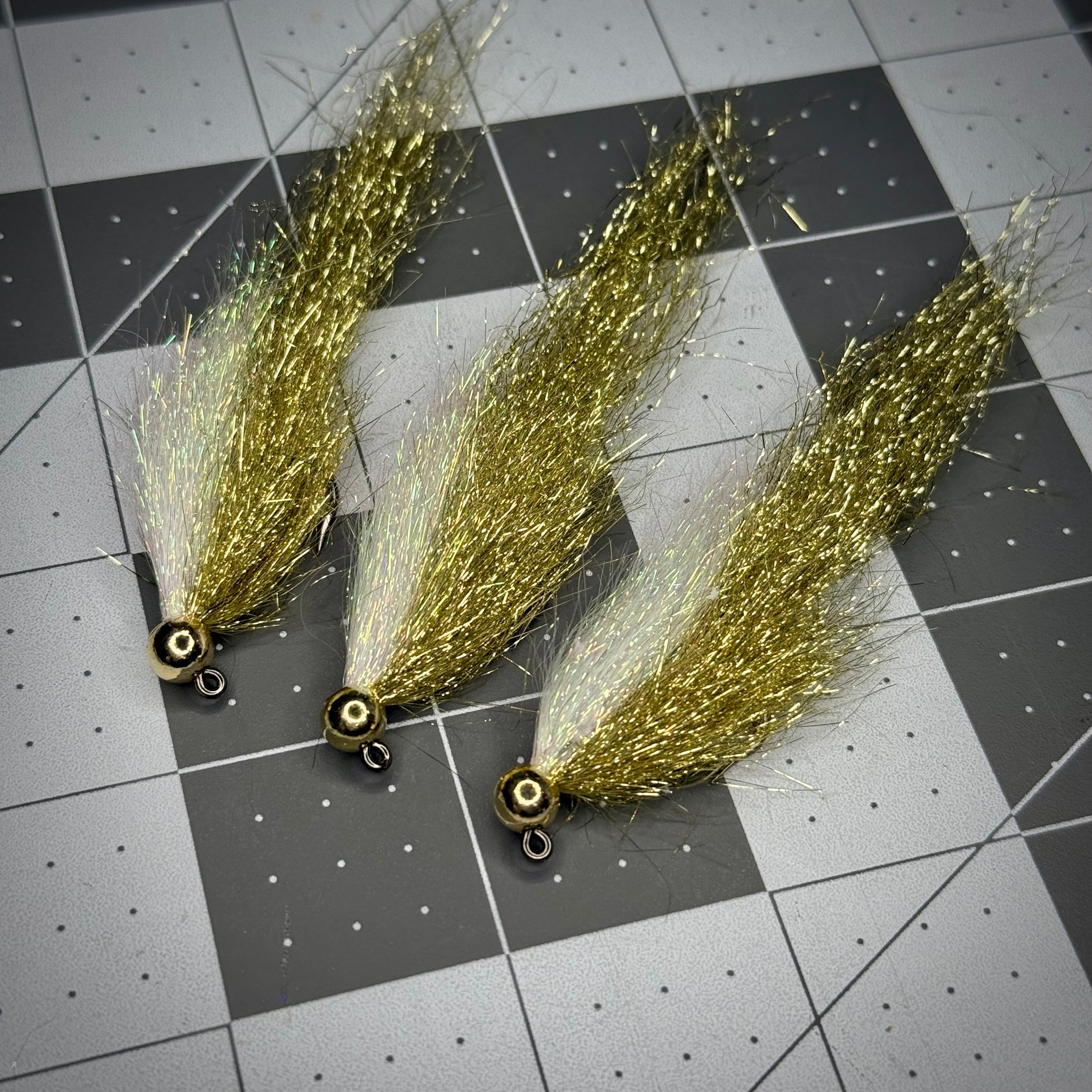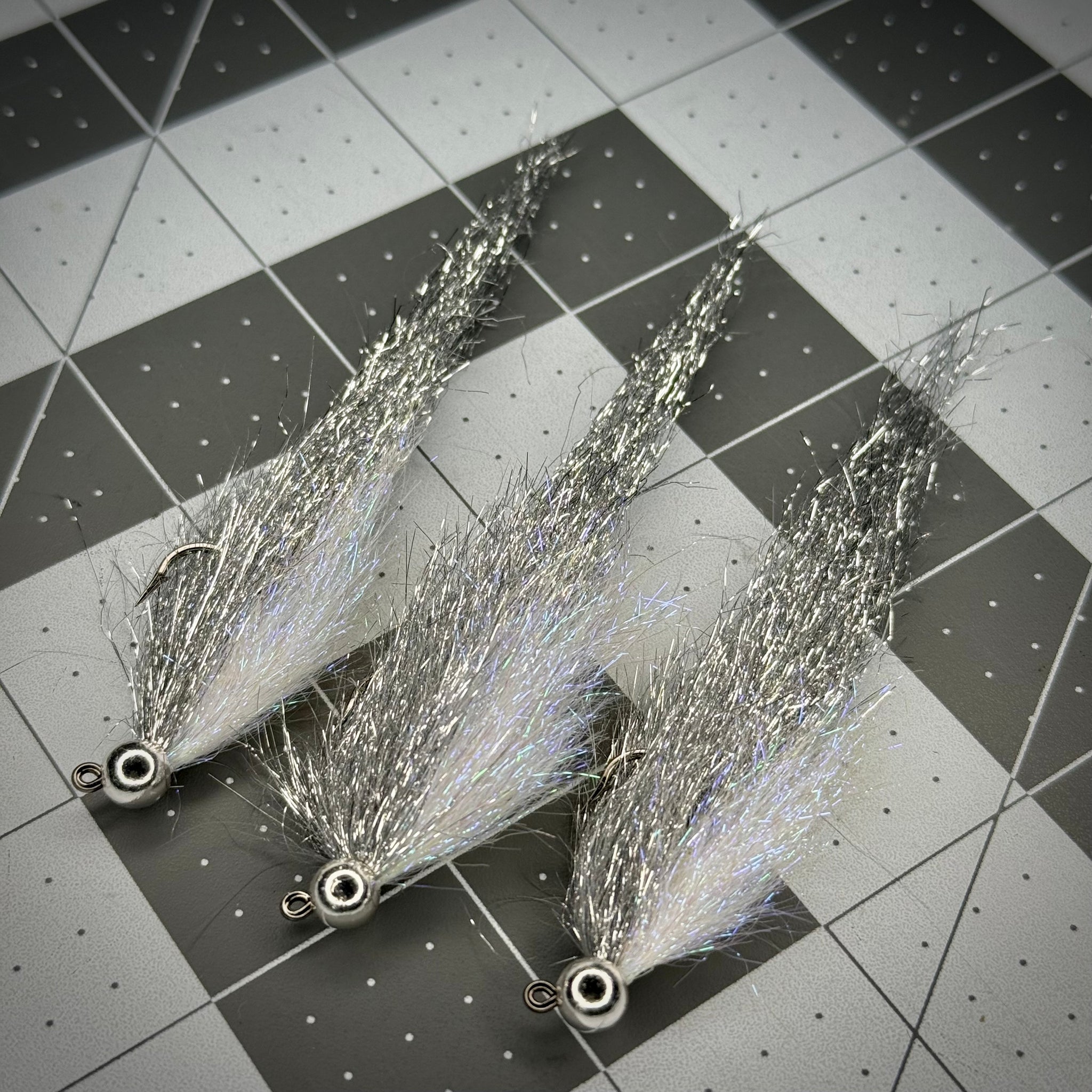 Inspiration for this pattern comes from a variety of sources, most notably Coffey’s Sparkle Minnow. I just wanted it on a jig hook that wouldn’t snag bottom as easily, more flash, and heavier. The beauty of flashy flies is that they tend to generate a territorial reaction strike, meaning you can catch fish with them that are not actively or even opportunistically feeding.