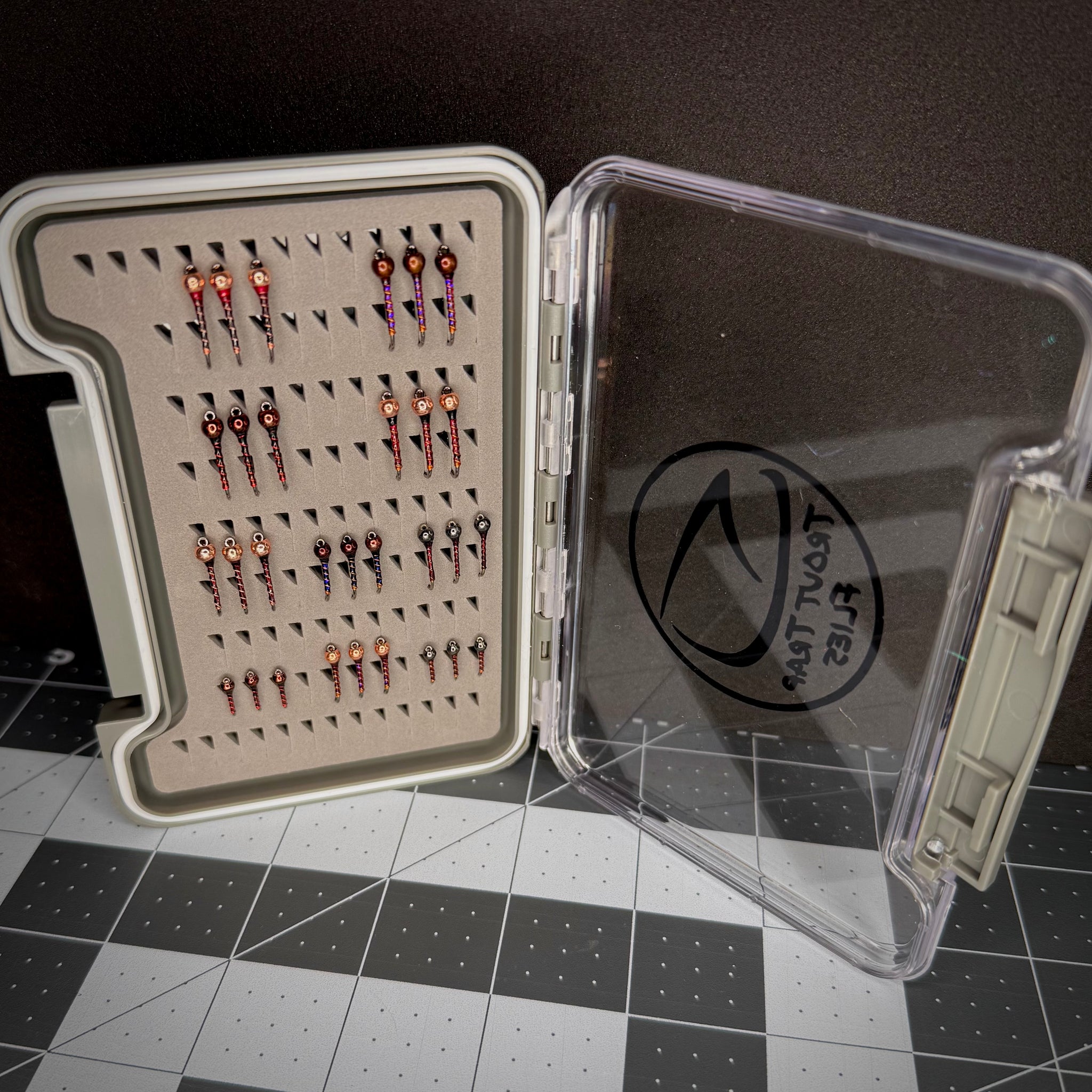 This box contains three each of ten different midge variants. It’s slim and easy to fit in your wader pocket. The wide variety of midges lets you adapt to changes in weather and lock in on the hot fly of the day. Includes the following: