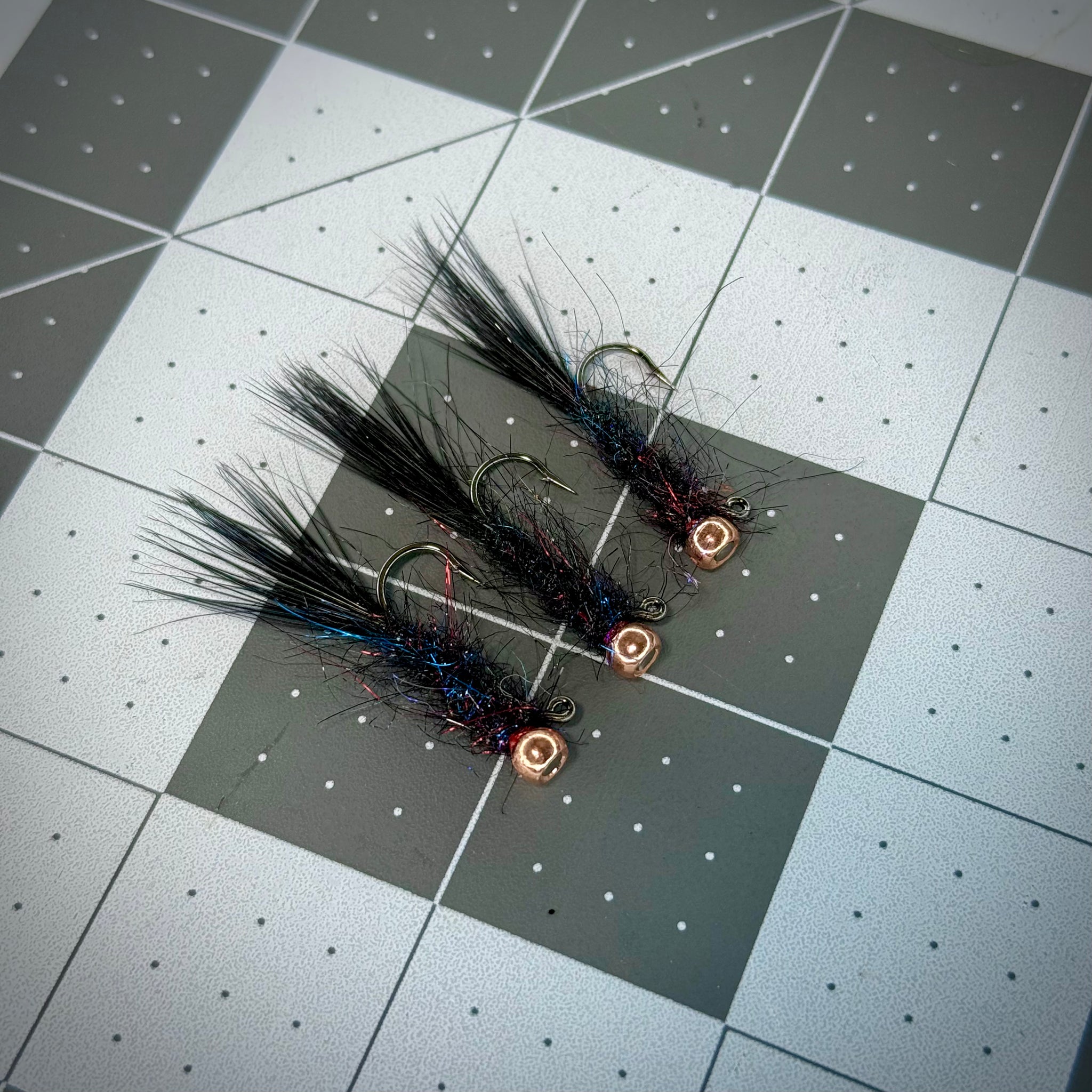 My larger size of leeches are just under 2” in total length. I blend each dubbing in house to create the perfect texture and match colors to marabou. Balanced leeches need to be slim, like these, in order to sink well. Instead of cheap, soft pins that bend, I tie my balanced leeches with stainless steel pins that are very strong and resist corrosion. Every fly is head cemented, so these can last through dozens of fish.